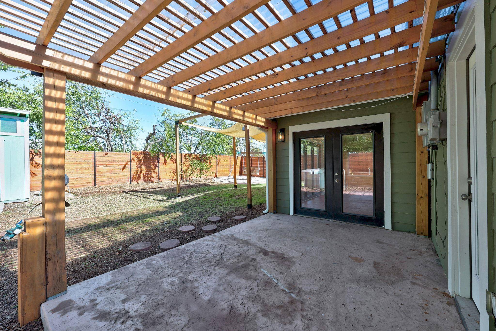 The backyard offers multiple areas for enjoyment with several entry points and features a pergola as well as a shade awning and shed for extra storage plus a rainwater collector.